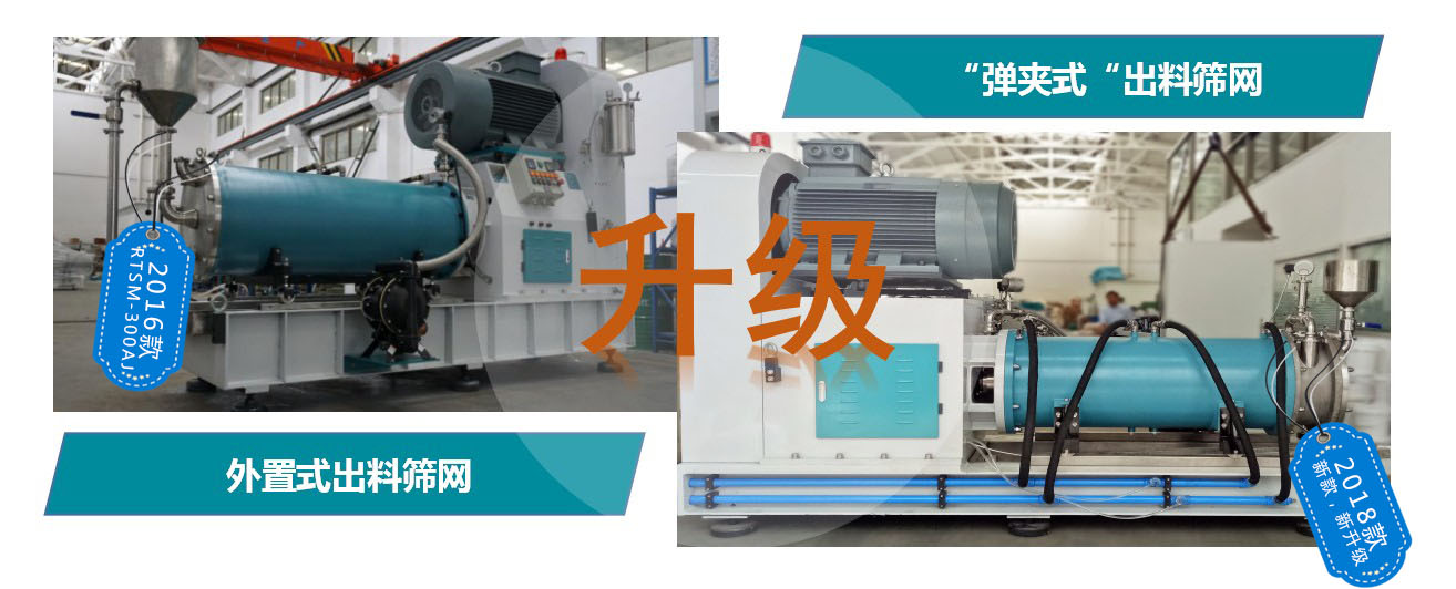 01 出料与分离:原来是设在研磨缸靠近主轴,由于内部物料流动方式是沿着筒边沿方向流动,容易堵塞;现在是设在研磨缸筒边沿,物料更加容易出料,而且物料和研磨介质在筒体边沿方向动能更大,因此不容易堵塞。